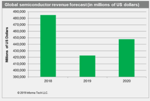 IHS Markit預計,2020年全球半導體市場收入將出現(xiàn)反彈,從2019年的4228億美元增至4480億美元,增幅會達到5.9%。這可能會讓英特爾、三星、臺積電、高通、Broadcom等全球頂尖半導體公司松一口氣。